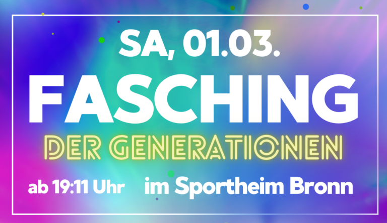 Seid dabei am Samstag, den 01.03. im Sportheim Bronn, wenn wir ab 19:11 Uhr gemeinsam feiern! Freut euch auf: Präsentiert von Sportverein, Feuerwehr, Dorfgemeinschaft und Dorfjugend Bronn. Wir freuen uns auf euch!